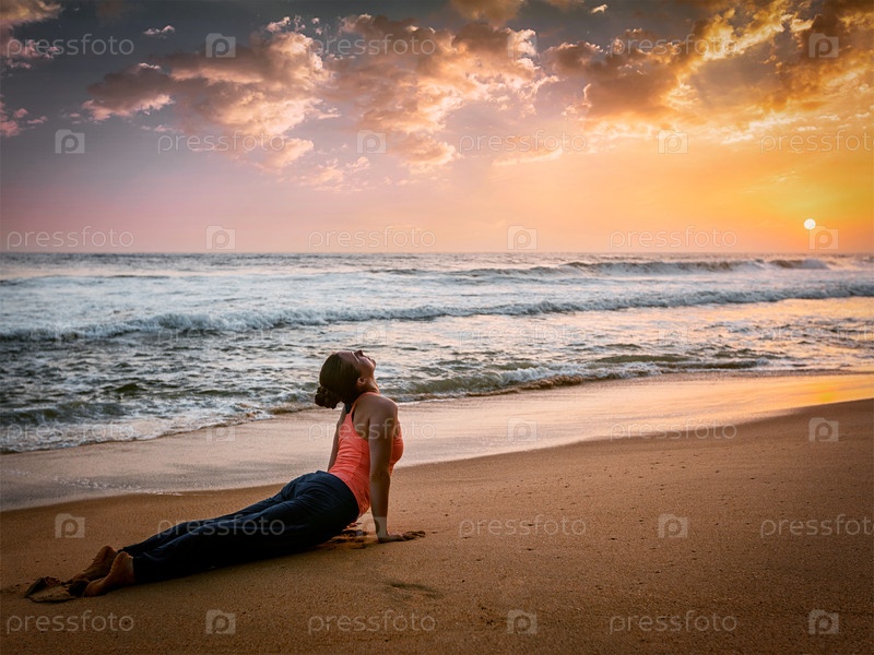 Йога на открытом воздухе - кто занимается Ашиату Виня Йога Сурья Намаскар Сан Приветствие Надежда Урдхва Лицо Свасаны - при закате солнца на пляже