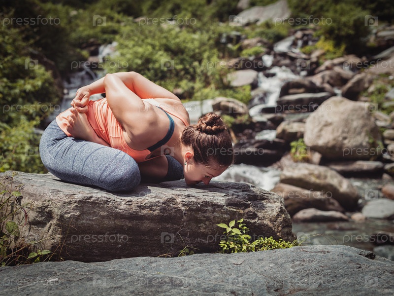 Молодая спортсменка занимается йогой на тропическом водопаде
