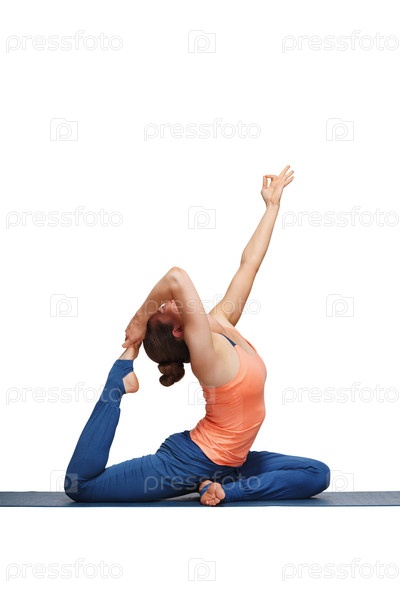 Женщина выполняет Hata Yoga Puna A Excada rajakapotanaa - одноногий геон-понс изолированный