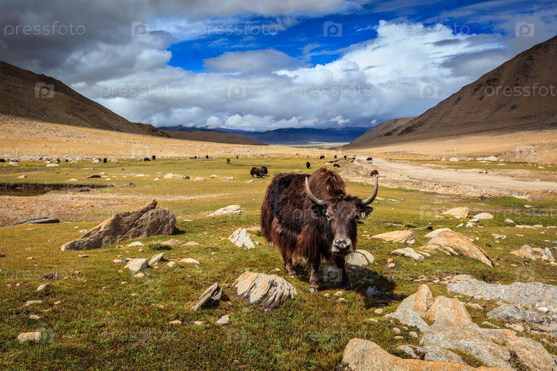 Яки, пасущиеся в Гималаях.Ладакх, Джамму и Кашмир, Индия