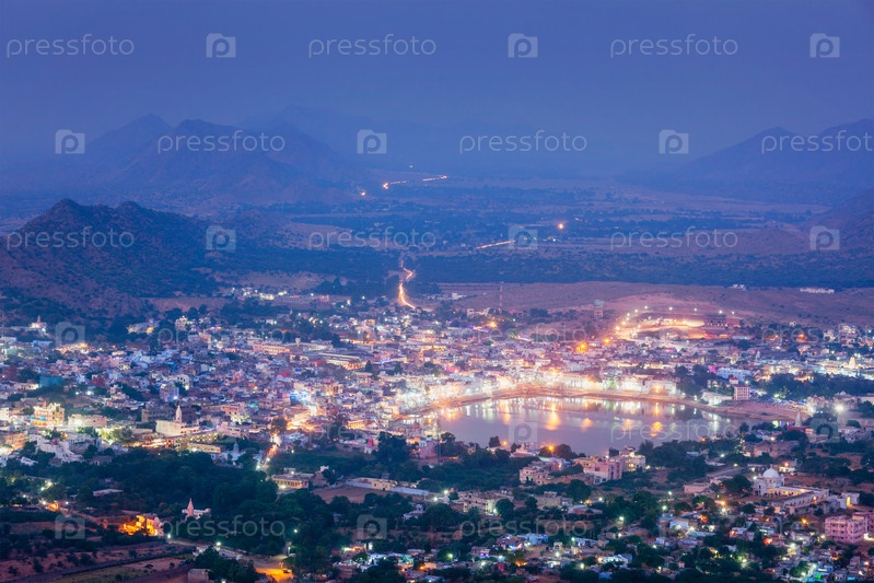 Священный город Пушкар с точки зрения птичьего полета на закате из храма Савитри