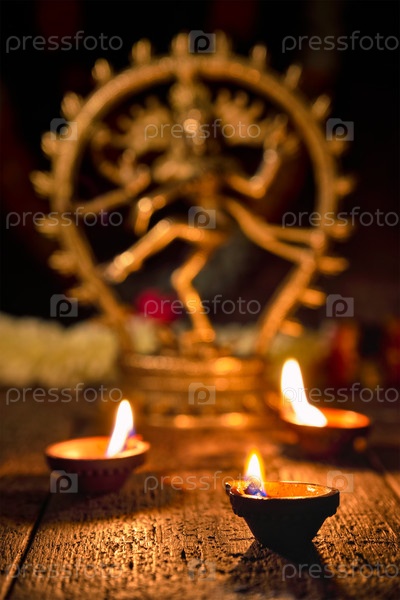 Концепция Maha Shivaratri или Diwali - статуэтка Шивы Натаражи с огнями дивали, масляные свечи, фокусируется на освещении, Индия