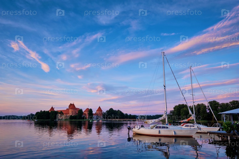Яхты и замок на острове Тракай в озере Галве, Литва при закате с драматическим небом, отражающимся в воде.Замок Тракай является одной из главных туристических достопримечательностей Литвы