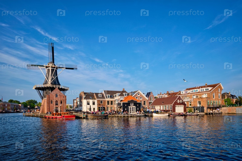 Гарлемский городской пейзаж - это знаковая ветряная мельница De Adriaan на реке Spaarn с лодками