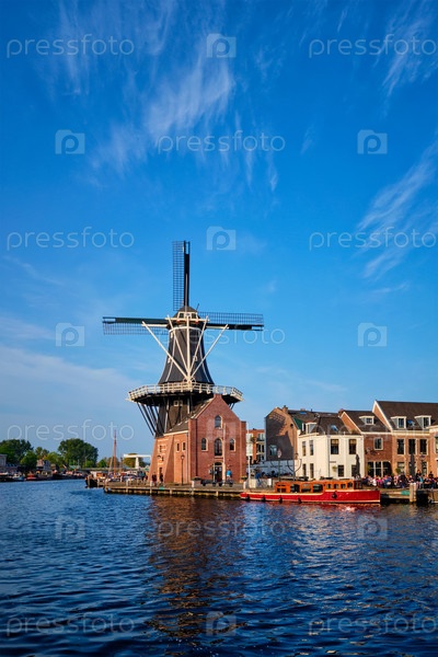 Гарлемский городской пейзаж - это знаковая ветряная мельница De Adriaan на реке Spaarn с лодками