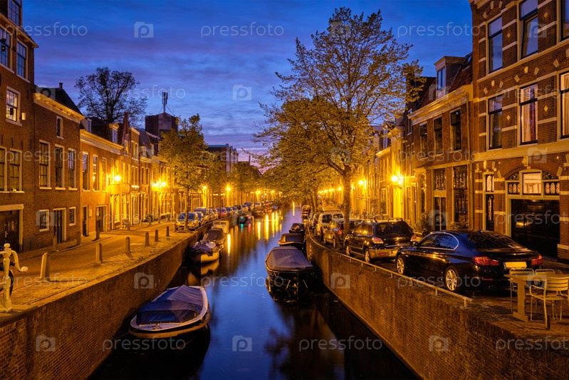 Типичным видом на голландский город является канал с лодками и домами, освещенными вечером