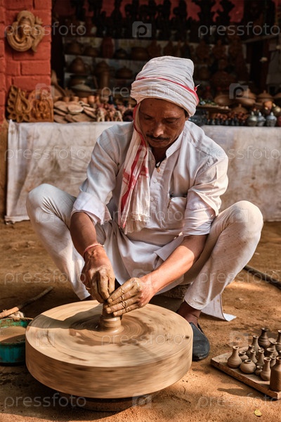 Индийский гончарный мастер на работе: бросает гончарное колесо и формирует керамический сосуд, а гончарные изделия: горшок, банка в глинтарной мастерской. Опытный ремесленник. Рукоделие из Шилпаграма, Удайпур, Раджастан, Индия
