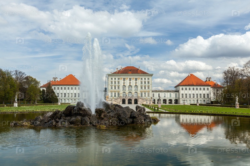 Фонтан в Гранд-Партере (грустный барокко) и тип здания Нимфенбургского дворца.Мюнхен, Бавария, Германия