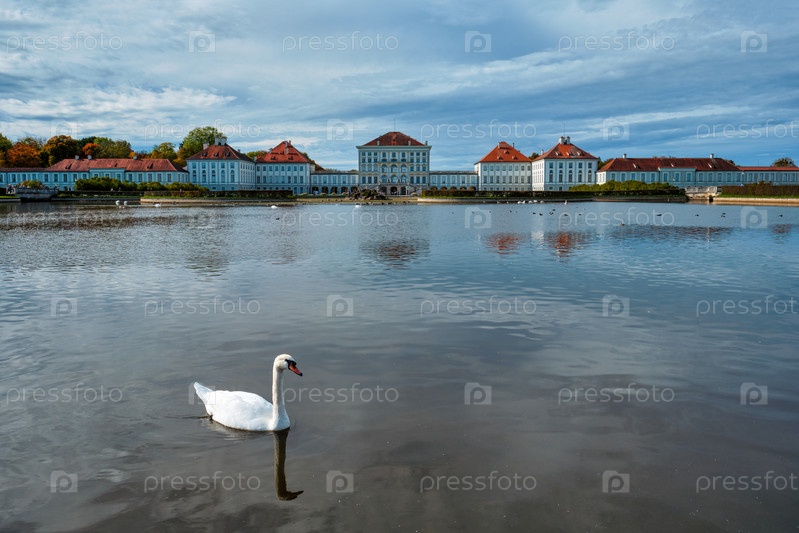 Лебеди в пруду перед Нимфенбургским дворцом.Мюнхен, Бавария, Германия