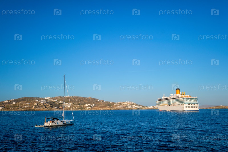 Лодка-яхта и круизное судно - Эгейское море.Хора, остров Миконос, Греция