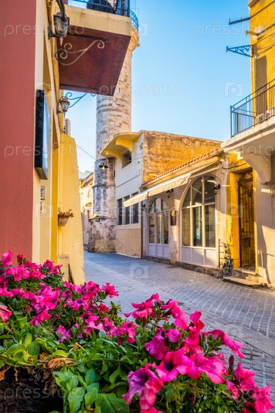 Живописные улицы Ханьи Венецианский город с уютными старыми домами.Утром в деревне Ханья греческий Чанака, остров Крит, Греция