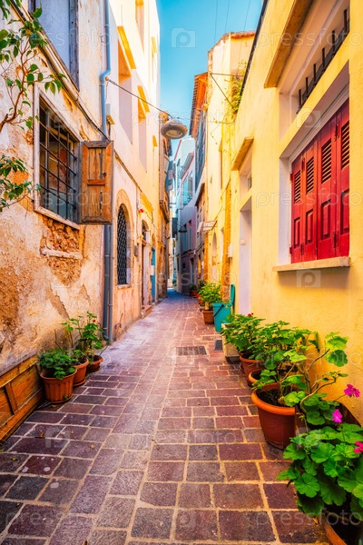 Живописные улицы Ханьи Венецианский город с уютными старыми домами.Утром в деревне Ханья греческий Чанака, остров Крит, Греция
