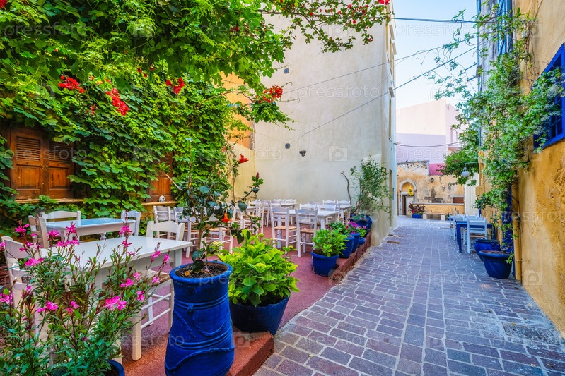 Уличное кафе на живописных улицах Ханьи, венецианского города с уютными старыми домами.Утром в деревне Ханья (греческий).Ханыка, остров Крит, Греция