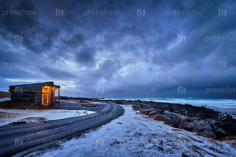 Шахта на побережье Норвежского моря в фьорде. пляж Скагсанден, Флакстад, Лофотенские острова, Норвегия в бурный вечер