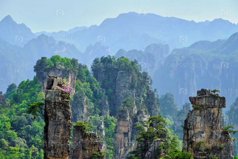 Известная туристическая достопримечательность Китая - каменные столбы скальных гор Чжанцзянджи при закате солнца в Улингюане, провинция Хунань, Китай