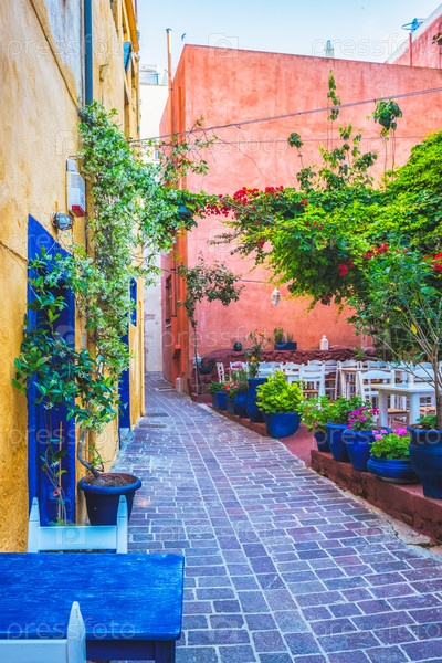 Уличное кафе на живописных улицах Ханьи, венецианского города с красочными старыми домами.Утром в деревне Ханьи греческий.Ханья, остров Крит, Греция