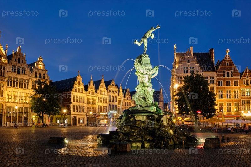 Антверпенский Большой рынок с знаменитой статуей Брабо и фонтаном ночью