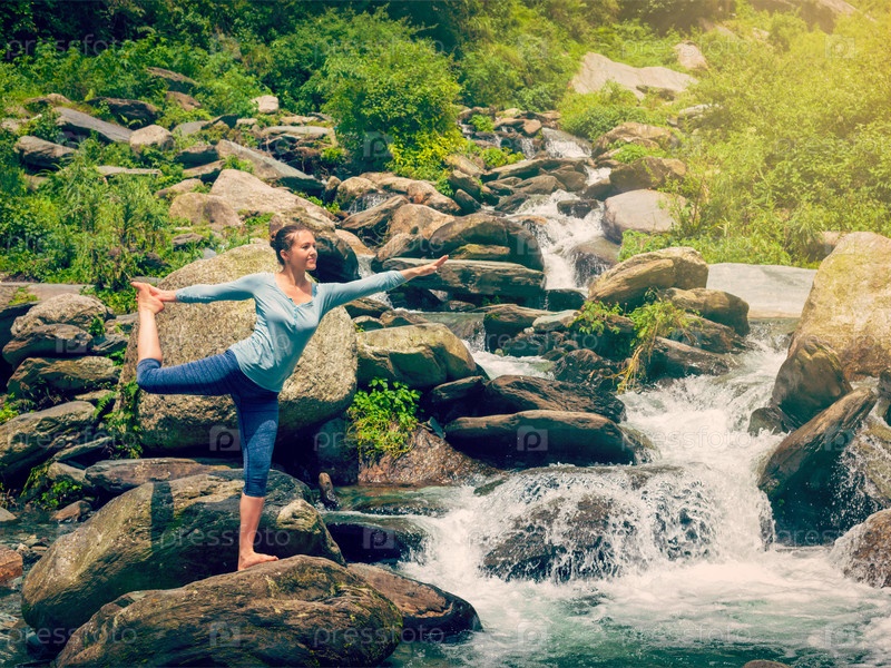 Наружная йога - женщина, практикующая асану йоги Natarajasana - Господь танцевального баланса позирует на открытом воздухе у водопада в Гималаях