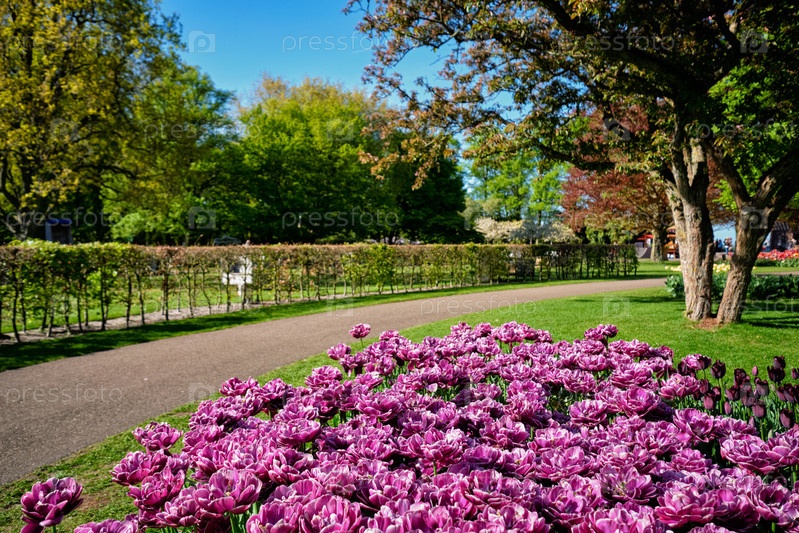 Цветение клумбы тюльпанов в цветочном саду Кеукенхофа, Нидерланды