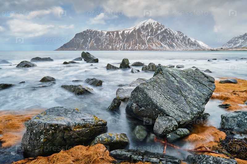 Скалистое побережье фьорда Норвежского моря зимой со снегом
