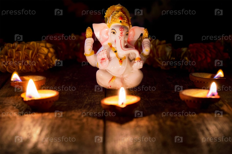 Ганеша Чатурти или концепция Дивали - фигура Ганеши с огнями дивали и масляными свечами, Индия