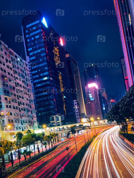 Уличное движение в Гонконге ночью.Офисные небоскребы и оживленный трафик на шоссе с размытыми пассажирскими дорожками.Гонконг, Китай