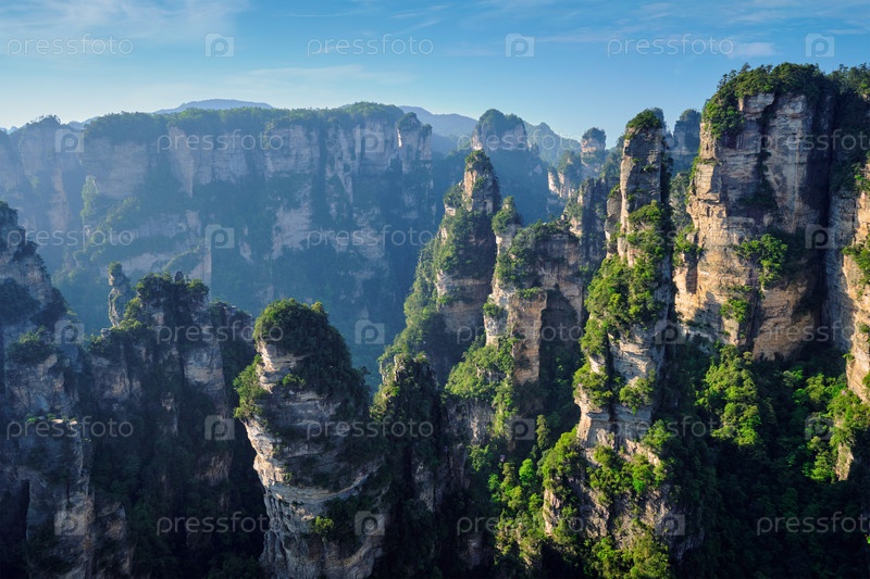 Известная туристическая достопримечательность Китая - каменные столбы скальных гор Чжанцзянджи при закате солнца в Улингюане, провинция Хунань, Китай