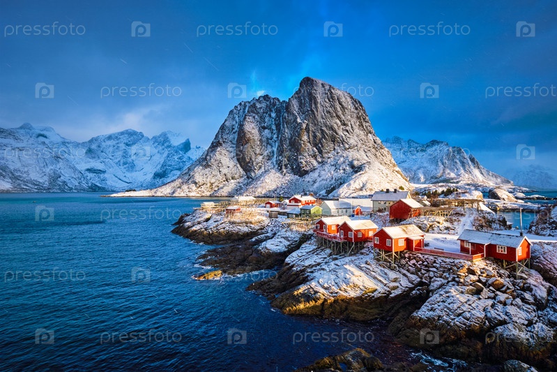 Известная туристическая достопримечательность рыбацкая деревня Хамна на Лофотенских островах, Норвегия с красными домами руербу зимой