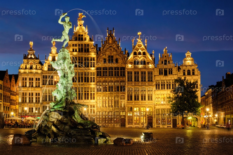 Антверпенский Большой рынок с знаменитой статуей Брабо и фонтаном ночью