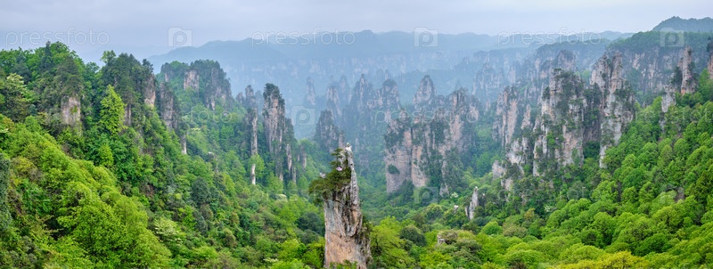 Известная туристическая достопримечательность Китая - Панорама каменных столбов скальных гор Чжанцзянджи в туманном облаке во Вулингюане, провинция Хунань, Китай