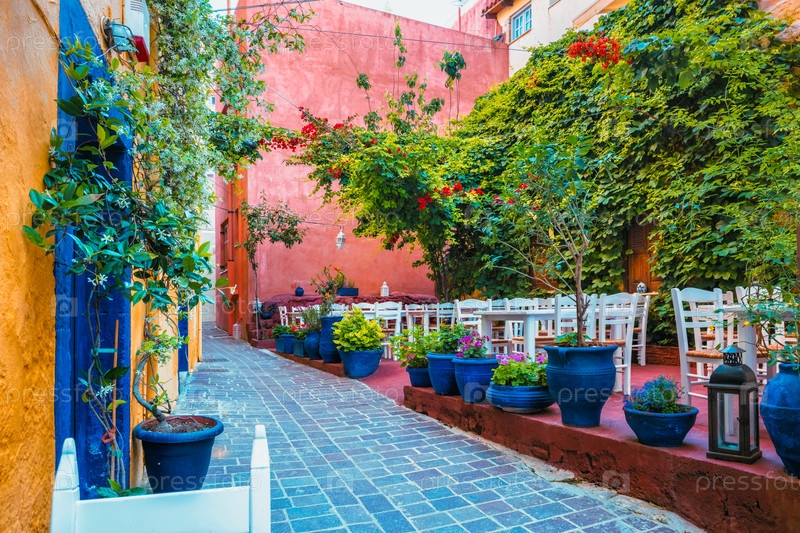 Уличное кафе на живописных улицах Ханьи, венецианского города с уютными старыми домами.Утром в деревне Ханья (греческий).Ханыка, остров Крит, Греция