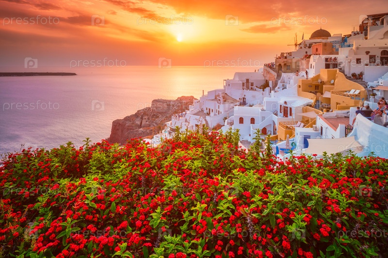 Закат солнца над городом Оя на острове Санторини летом