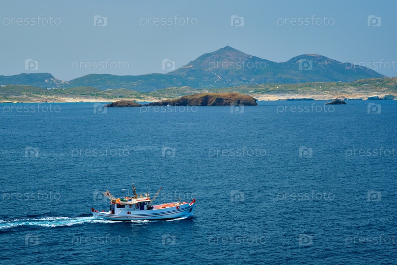 Греческая рыбацкая лодка в голубых водах Эгейского моря недалеко от острова Милос, Греция