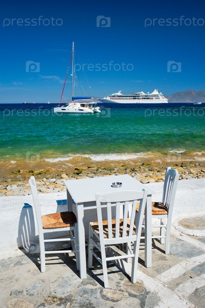 Туристическая греческая сцена - это прибрежный ресторан-кафе стол с катамаранской яхтой и круизным лайнером и Эгейским морем на заднем плане в красивый летний день.Хора, остров Миконос, Греция