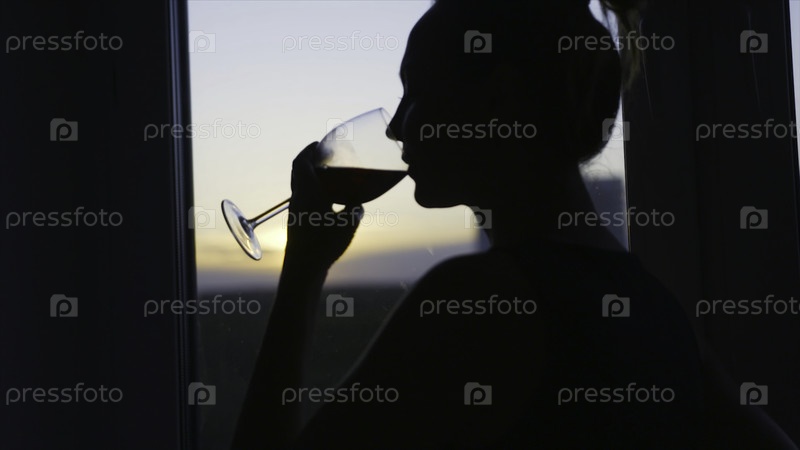 Женщина наслаждается выпивкой вина у окна. Давай-ка. Красивая женщина пьет красное вино дома. Силуэт женщины, пьющей вино перед вечерним окном