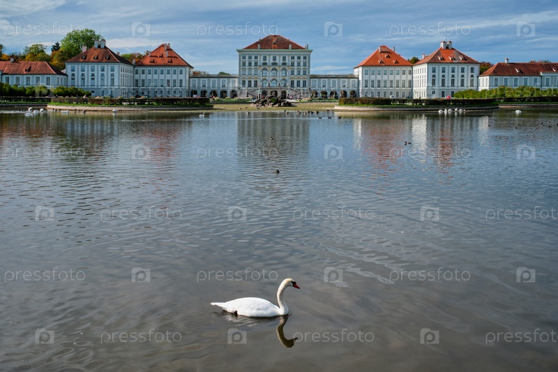 Лебедь в пруду возле Нимфенбургского дворца.Мюнхен, Бавария, Германия