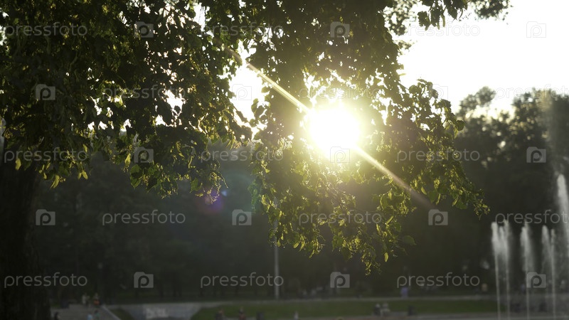 Зеленый парк летом во время захода солнца