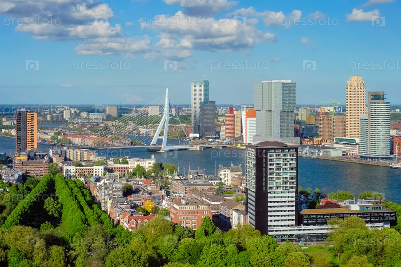 Вид на город Роттердам и мост Эразмус через реку Ниуэ Маас с Euromast