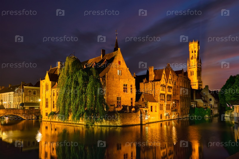 Известным видом на туристическую достопримечательность Брюгге является канал Розенхоedkaai с колокольником и старыми домами вдоль деревянного канала ночью