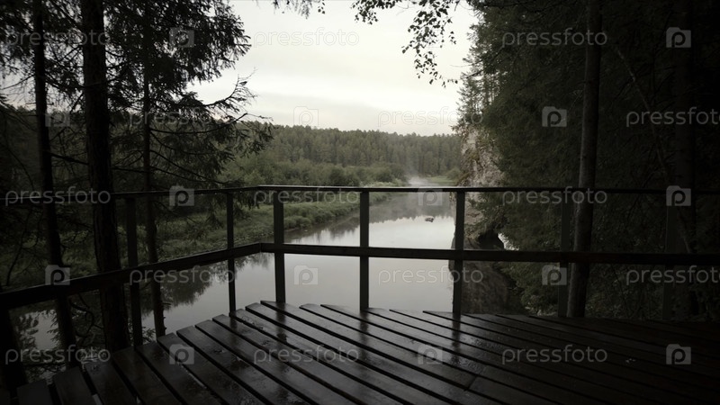 ландшафт с рекой, протекающей в лесной зоне при пасмурной погоде. резервные кадры. вид на лесную долину с рекой и горизонтом с облачным небом