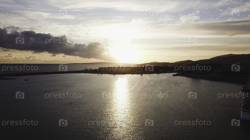 Красивый синий фон заката неба. Сток. Вид сверху на закат в море. Драматический закат у моря