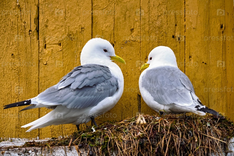 Медведи на гнезде против желтой стены.Острова Лофотен, Норвегия