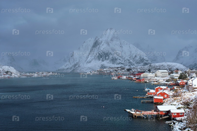 Рейнская рыбацкая деревня на Лофотенских островах с красными домами руербу зимой со снегом. Норвегия