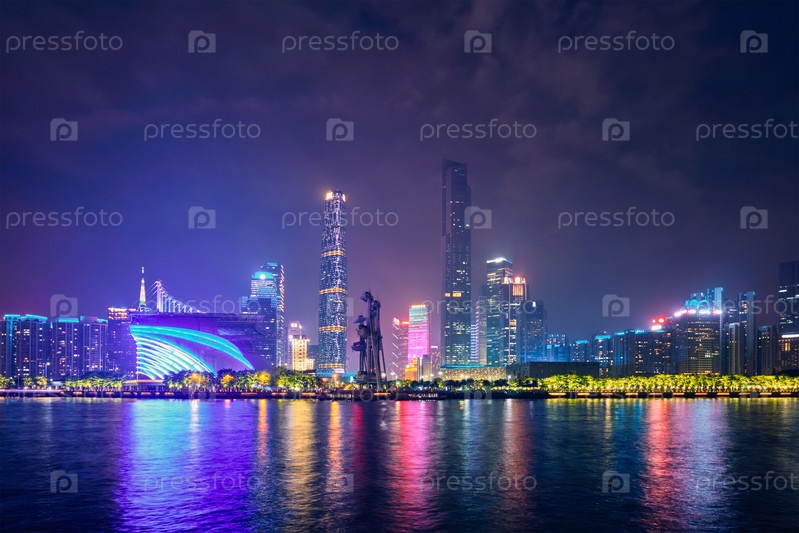 Городской пейзаж Гуанчжоу над Рекой Жемчужины освещается вечером