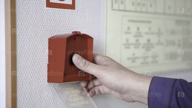 Рука мужчины подталкивает пожарную сигнализацию на стене.Клип.Рука человека подталкивает переключатель пожарной сигнализации к белой стенке в качестве фона для чрезвычайных ситуаций в новом здании завода