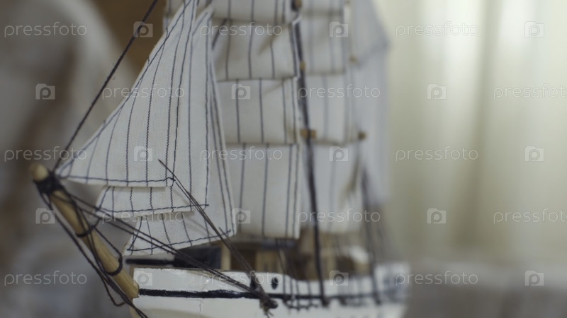 Близкий план небольшой морской белой модели корабля из дерева на полосатом фоне на размытом световом фоне. резервные кадры. хобби и концепция коллекционирования