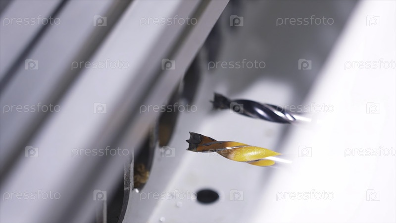 Закрытие автоматической древесной буровой машины на мебельной фабрике.Концепция производства, производства и деревообрабатывающей промышленности