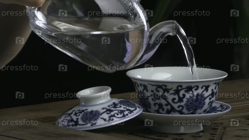 Процесс заваривания чая, чайная церемония, чашка свежеприготовленного черного чая. азиатский чай на бамбуковом коврике. китайцы из литой кастрюли