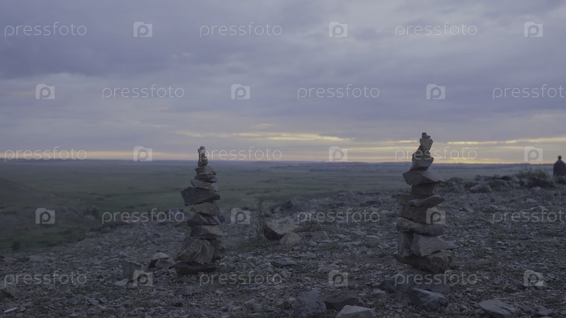 Песчаные камни Зенская башня и баланс. кучка камней против неба. каменная башня на фоне поля и утреннего неба
