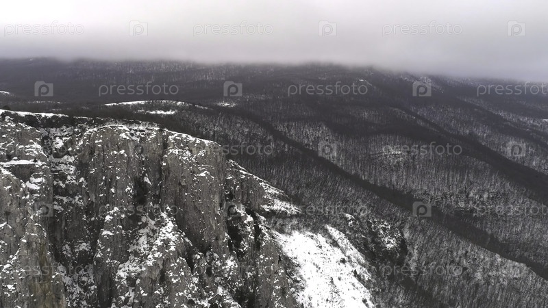 Зимняя сцена в горах. Съемка. Вид на заснеженный горный пейзаж в лесу